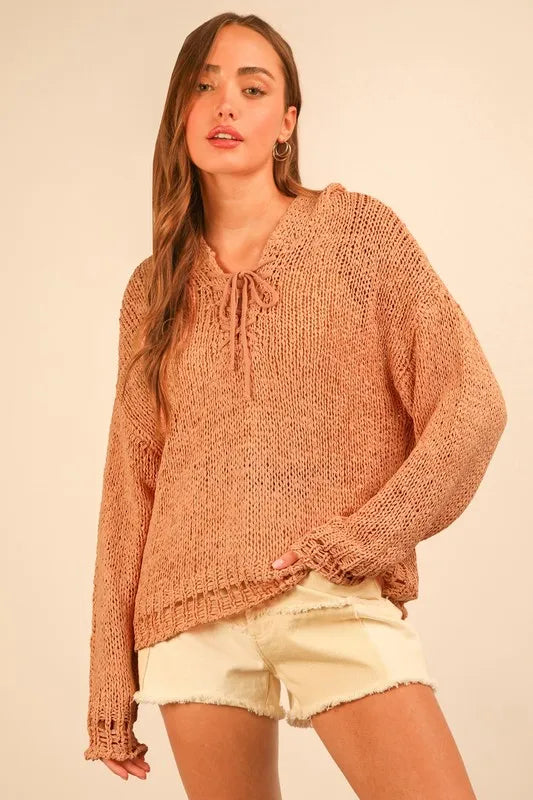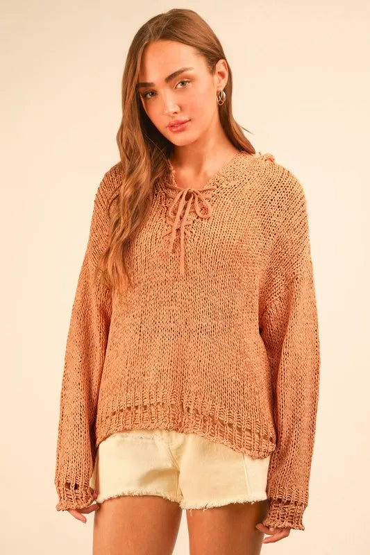 An oversized openwork lace-up hooded sweater is a trendy and cozy garment featuring a loose and roomy fit, an openwork knit design, and a lace-up detail on the front. The oversized style provides a comfortable and relaxed silhouette, while the openwork knit adds a touch of texture and visual interest to the sweater. The hood adds a casual and functional element, perfect for cooler weather. The lace-up detail on the front adds a stylish and edgy touch, making this sweater a fashionable choice for a chic and cozy look.